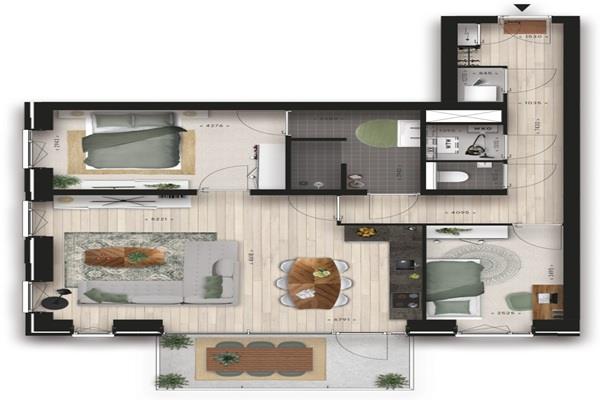 De L-vormige witte keuken is voorzien van koel/vriescombinatie, oven met magnetronfunctie, inductie kookplaat en een vaatwasser. De moderne en comfortabele badkamer is voorzien van een inloopdouche en een dubbele wastafel met spiegel. Het zwevende toilet met fontein bevindt zich in een aparte ruimte. Het appartement heeft 2 slaapkamers en een groot balkon die via de riante woonkamer te betreden is.