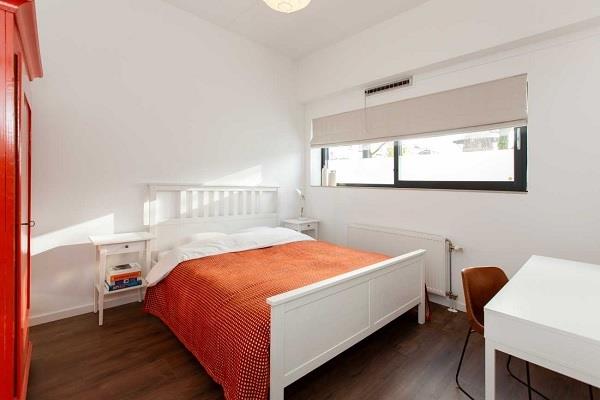 Aan de achterzijde ligt, enkele treden hoger, de woonkeuken, eveneens bereikbaar via een schuifpui die leidt naar het terras aan de gemeenschappelijke binnentuin. De keuken is compleet uitgerust met diverse inbouwapparatuur, waaronder een oven, vaatwasser, koel-/vriescombinatie en een inductiekookplaat met vijf zones.