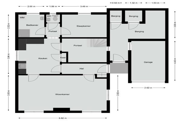 Vanuit de voortuin is er toegang tot de berging en een garage, deze wordt echter niet meer als dusdanig gebruikt, deze is 4.43 x 2.62. De berging heeft nog twee aparte ruimtes.