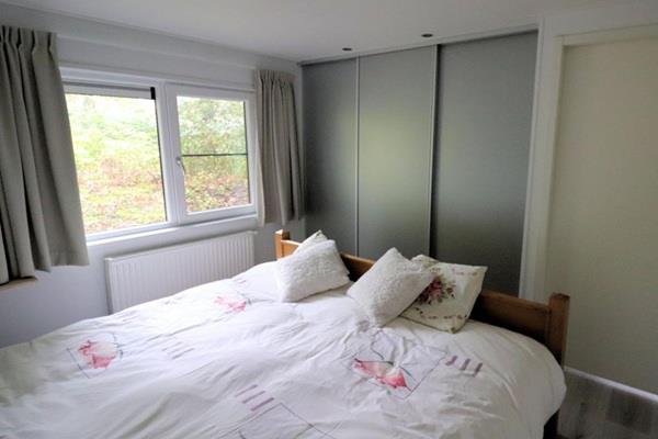 Indeling: beveiligde entree, centrale hal die toegang geeft aan alle vertrekken. De living bestaat uit een ruime woonkamer met uitzicht op de vijver, met aansluitend de woonkeuken welke voorzien is van een keurig keukenblok voorzien van inbouwapparatuur: gasfornuis, afzuigkap, vaatwasser, koel- en vrieskast en combimagnetron.