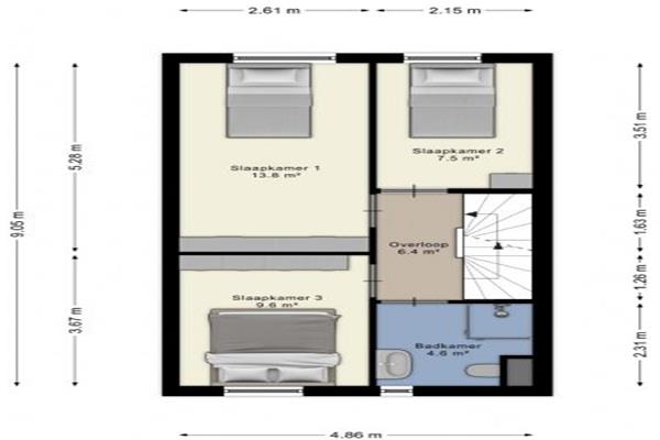 Op de eerste verdieping bevinden zich drie comfortabele slaapkamers. De kamers zijn prettig van formaat en genieten van veel daglicht. De moderne badkamer is compleet uitgevoerd en beschikt over een douche, toilet en wastafel. Een praktische en comfortabele verdieping die perfect aansluit bij de woonwensen van nu.