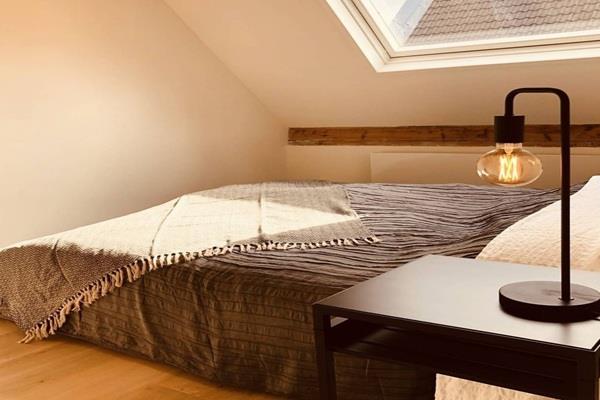 Ruime sfeervolle slaapkamer met balkenconstructie ingericht met een tweepersoons bed.