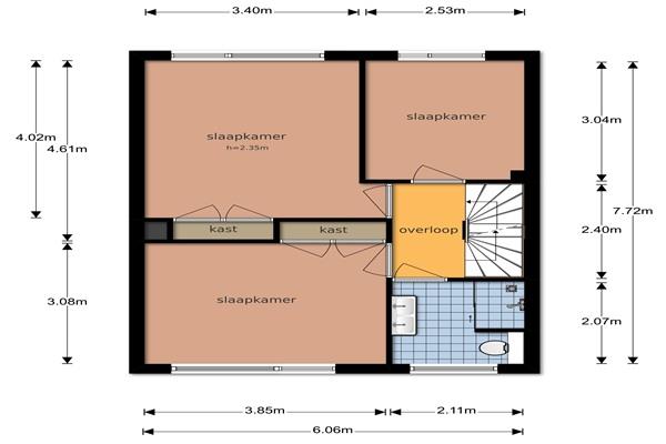 Overloop, 3 slaapkamers. De badkamer van ca. 4 m² is voorzien van een douchehoek, wastafel, 2e toilet en radiator.
