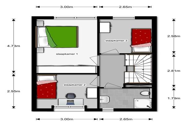 1e Verdieping: Overloop en 3 slaapkamers. Badkamer gelegen aan de voorzijde van de woning voorzien van douchehoek, 2e toilet en vaste wastafel.