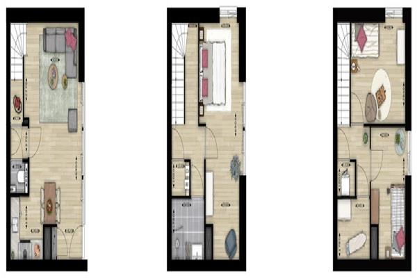 Kom binnen in een lichte living met grote glazen pui, moderne open hoekkeuken voorzien van inbouwapparatuur zoals 4 pits kooktoestel, koelkast, combi magnetron en vaatwasser. Daarnaast is er een apart toilet met fontein en kleine berging aanwezig. Via de vaste trap bereik je de 1e verdieping waar zich een compleet afgewerkte badkamer met inloopdouche, een royale slaapkamer en de stookruimte bevindt. Neem je nogmaals de trap naar boven dan treft je daar 2 extra slaapkamers en een handige bergruimte aan.