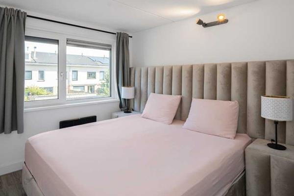 De vaste trap leidt naar de tweede verdieping, waar een ruime vierde slaapkamer is gerealiseerd. Deze kamer is eveneens netjes afgewerkt en voorzien van een pvc-vloer. Vanuit de slaapkamer heb je toegang tot het zonnige dakterras, gelegen op het westen – perfect om in de avond nog even van de zon te genieten. Ook bevinden zich hier de aansluitingen voor wasmachine en droger.
