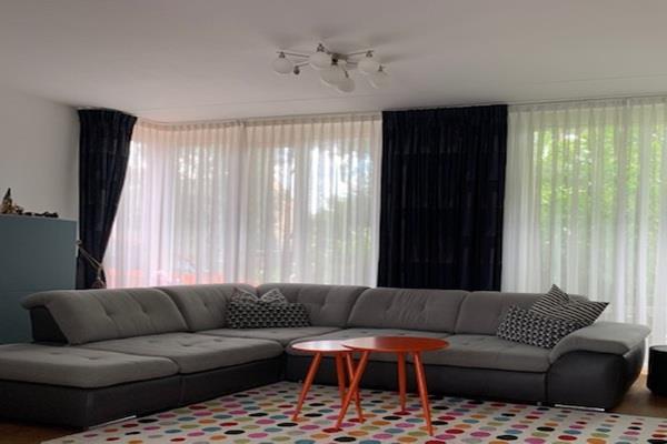 Royale L-vormige woonkamer aan de straatzijde met een ruime zithoek en eetgedeelte met hoge eettafel. Via de woonkamer kunt u via een schuifdeur naar buiten.
