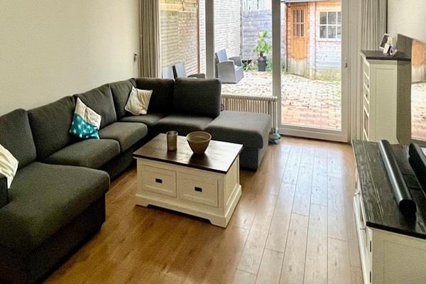 Entree vanaf de straat naar de gang met het toilet. Openslaande deuren naar de ruime woonkamer, smaakvol ingericht met een eet- en zithoek. Schuifpui naar de zonnige tuin met klein schuurtje en tuinmeubilair.
