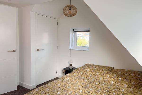 De trap in de woonkamer brengt je naar de eerste verdieping. Aan de achterzijde bevindt zich de eerste slaapkamer, ruim en praktisch in te delen. In het midden vind je de moderne badkamer met stortdouche, wastafel en toilet. Aan de voorzijde ligt de tweede slaapkamer, met prachtig uitzicht over de Oudegracht, een unieke plek om de stad te ervaren.