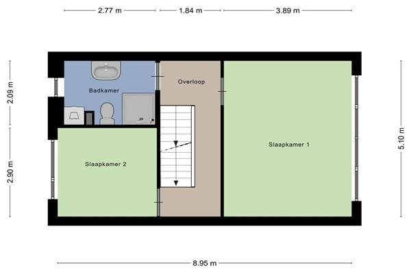 Op de 1e verdieping zijn een 2-tal slaapkamers en een ruime badkamer aanwezig. De slaapkamers hebben ruime afmetingen. De badkamer is voorzien van een douche, 2e toilet, wasmachine aansluiting en wastafel.