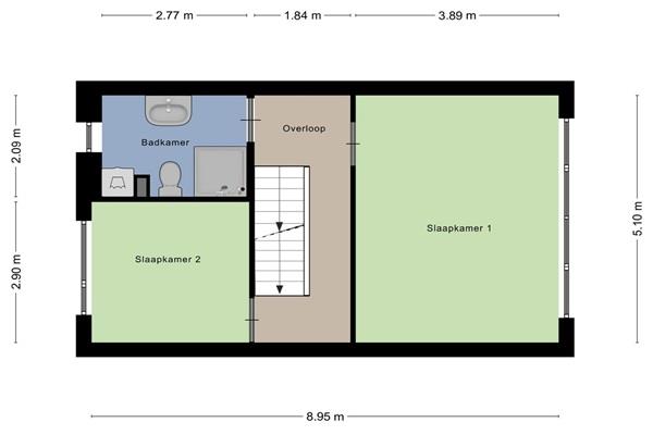 Op de 1e verdieping zijn een 2-tal slaapkamers en een ruime badkamer aanwezig. De slaapkamers hebben ruime afmetingen. De badkamer is voorzien van een douche, 2e toilet, wasmachine aansluiting en wastafel.