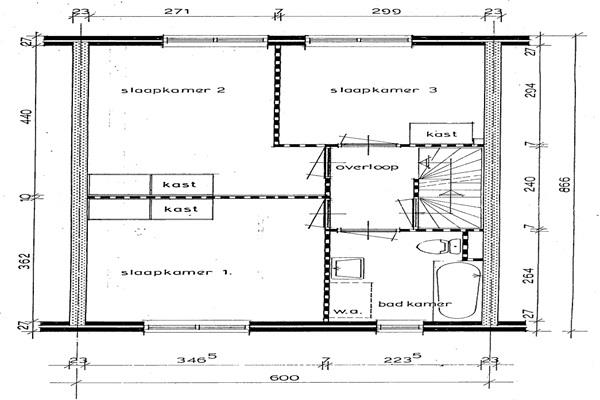 Via de overloop bereik je slaapkamer één, twee en drie en de badkamer. De badkamer beschikt over een ligbad, douche, wastafel en toilet.
