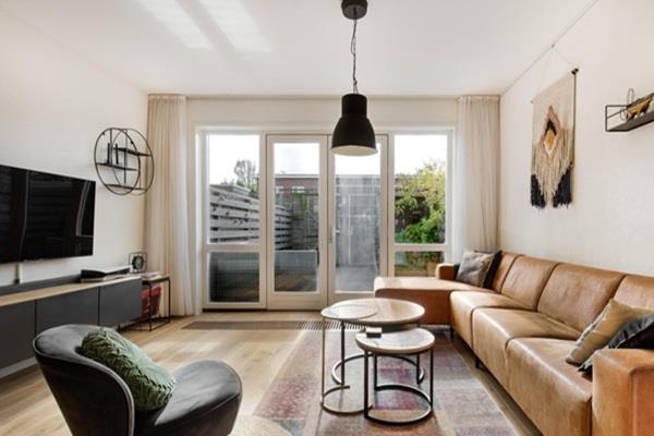 Ruime en lichte woonkamer met trapkast aan de achterzijde en moderne keuken in L-opstelling aan de voorzijde.