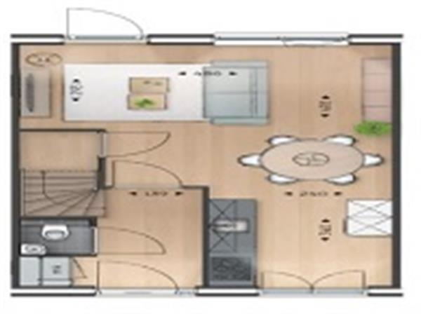 Via de entree betreedt je de hal met toilet, meterkast en trapopgang. Via de hal is de woonkamer met een halfopen, compleet ingerichte keuken te bereiken.