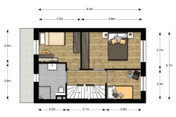 De overloop geeft toegang tot de slaapvertrekken en de badkamer. Hier zijn 3 slaapkamers aanwezig. De complete badkamer is strak afgewerkt met een modern wastafelmeubel, wandcloset en een aparte douche.