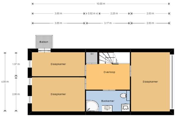Ruime overloop, nette badkamer voorzien van douche, wastafel en 2e toilet, ruime en lichte voorkamer 4.85x2.81, ruime achterkamer 3.88x2.77, achter-zijkamer ca. 3.88x2.01 met deur naar balkonnetje.