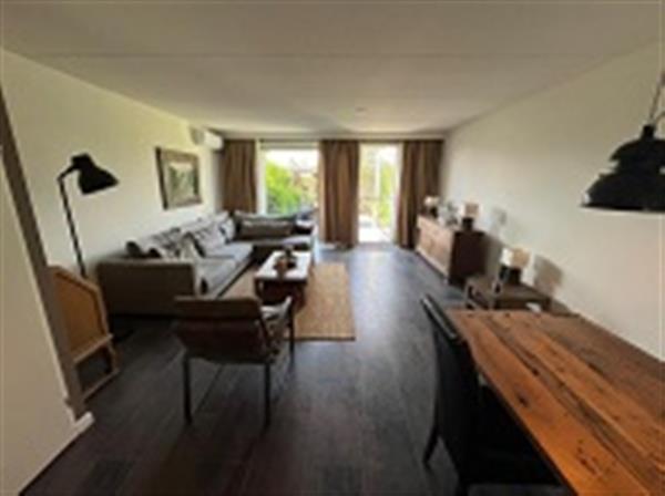 Entree, ruimte voor wasmachine en droogtrommel, toilet met wandcloset, ruime tuingerichte uitgebouwde woonkamer met airco, luxe open keuken met merkapparatuur waaronder inductie kookplaat, afzuigkap, combi oven, vaatwasser, koelkast en vrieskast.