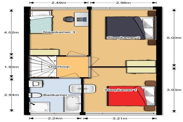Overloop, 3 slaapkamers, badkamer (met douche wastafel en toilet).