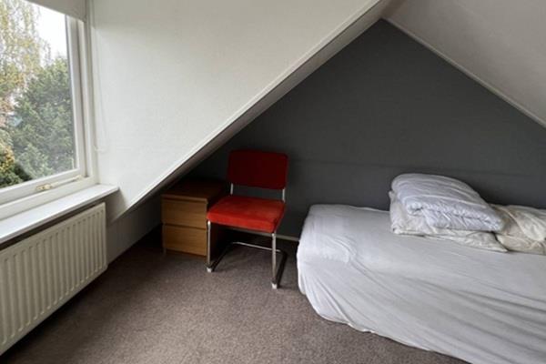 Overloop, 2 slaapkamers en een badkamer met douche en wastafel.