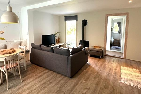 Via uw eigen tuinpad komt u bij dit prachtige landelijk gelegen huisje. U komt binnen in de hal met garderobe. Rechts van de hal ligt de woonkamer van waaruit u een riant uitzicht heeft over de ruime tuin met veel privacy en weids uitzicht op een paardenweidje en de duinen. Ook kunt u in de woonkamer genieten van warmte van een romantische houtkachel. In de woonkamer vind u ook nog een ruime 2 persoons slaapbank. De openkeuken heeft een landelijke uitstraling, voorzien van een retro koelkast met vriesvak, 5-pits inductiekookplaat, afzuigkap en een elektrisch oventje.
