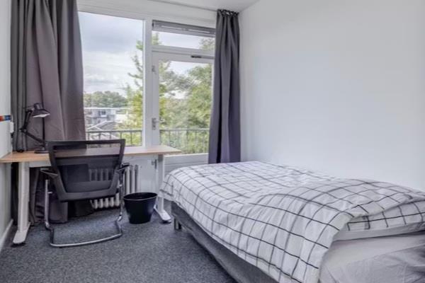 De kamer is volledig gemeubileerd en beschikt over een bed, bureau, stoel en kledingkast.