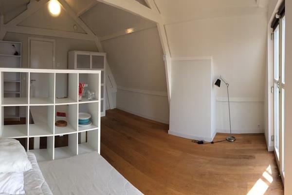 De kamer (oppervlakte ca. 40m2) is gelegen aan de voorzijde van de woning en is met zijn hoge plafond bijzonder mooi en ruim,