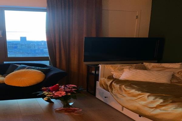 De kamer ligt op de 11e verdieping en biedt een prachtig uitzicht, alsof je in een New Yorks penthouse woont. Het gebouw beschikt over verschillende dakterrassen en ligt pal naast de deur