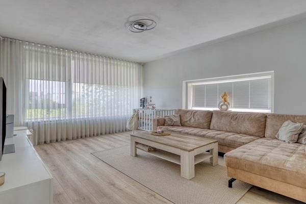 De indeling is als volgt: De entree is licht en verzorgd, met witte tegels, een rond vloerkleed en een rode voordeur als opvallend accent. De woonkamer heeft een moderne en lichte uitstraling, met een rustige en natuurlijke uitstraling. De ruimte is ingericht in neutrale tinten met een combinatie van beige, wit en hout. De keuken is modern, strak en functioneel vormgegeven.