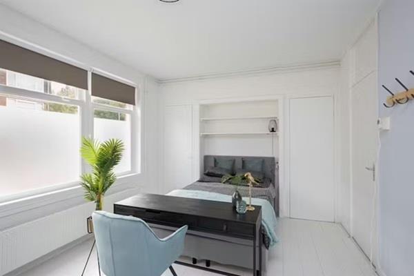 De kamer bevindt zich aan de voorzijde van dit appartement op de begane grond. De kamer is smaakvol ingericht met modern meubilair en beschikt over alles wat een student nodig heeft. De kamer is gemeubileerd met een comfortabel bed, een bureau, een ruime kledingkast en een fijne stoel.