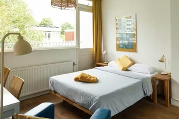 Lichte slaapkamer op de bovenste verdieping van een drieverdiepingen tellend herenhuis in Buitenveldert. Queensize bed (160x200cm), natuurlijk latex van Coco-mat. Ideaal voor iedereen die op zoek is naar een betaalbaar alternatief voor een tijdens een stage of studie in Amsterdam.