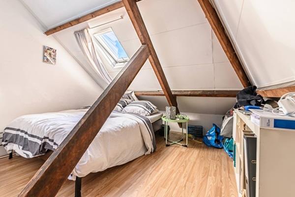 De slaapkamer bevindt zich op een aparte verdieping en beschikt over een ingebouwde kast van circa 3 m², wat zorgt voor extra bergruimte.