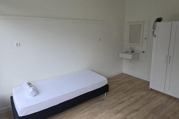 16 m², gemeubileerd met een eenpersoonsbed, linnenkast en bureau met stoel.