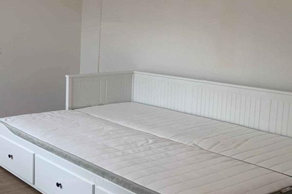 De woonruimte is praktisch ingedeeld en voorzien van een bed, eettafel met stoelen en veel daglicht dankzij de grote ramen. De afwerking is licht en neutraal, waardoor de ruimte fris en ruimtelijk aanvoelt. Een eigen wastafel in de kamer zorgt voor extra comfort en privacy.