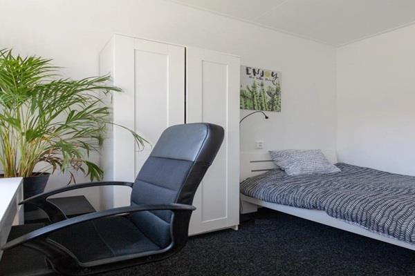 De kamer zelf ligt aan de voorzijde van het appartement en is ingericht met een bed, bureau, kledingkast en heeft een groot raam waardoor veel natuurlijk licht naar binnen valt.