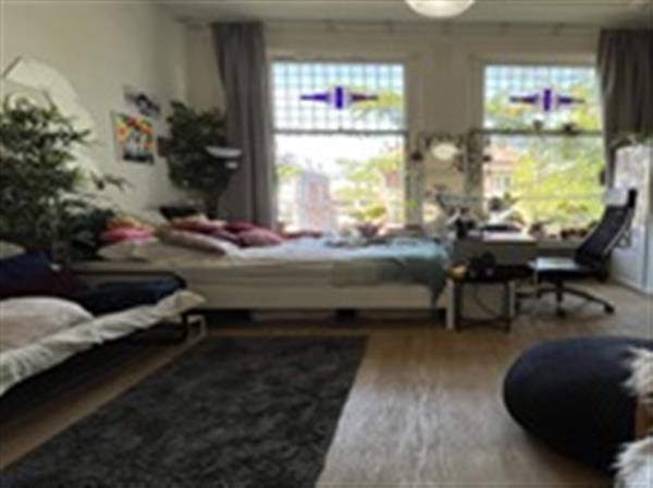 De kamer heeft verder inbouwkasten en een wastafel. De kamer is door het hoge plafond zeer geschikt voor een hoogslaper. Naast de kamer is er nog een gemeenschappelijke woonkamer van ongeveer 10m². Deze deel je net als de douche, keuken, balkon en toilet met 4 huisgenoten.