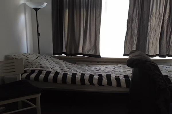 Deze gezellige eenpersoonskamer is zeer natuurlijk verlicht en volledig ingericht met uitstekende thermische en geluidsisolatie. Geheel langs (niet-verkeersstraatkant) het dubbele glazen raam aan de muur. Het heeft een eenpersoonsbed met uitstekende matraskwaliteit, grote kledingkast, studeerruimte (kantoortafel, stoel en lamp), zithoek (fauteuil, theetafel, staande lamp), bibliotheekplanken. Met deze kamer is de gemeenschappelijke zitruimte direct verbonden.