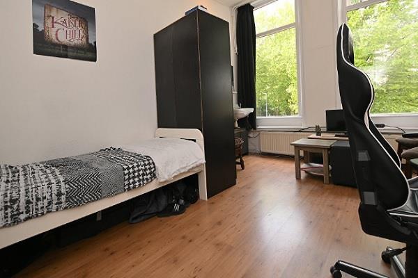In de ruime kamer is voldoende plaats voor alle meubels. Door het hoge plafond kan er een hoogslaper geplaatst worden, hierdoor creëer je meer ruimte voor bijvoorbeeld nog een leuke zithoek. Ook is er voldoende ruimte voor een kledingkast en een bureau/eettafel. Er is een eigen wastafel aanwezig. De voorzieningen zoals de keuken, badkamer en het toilet deel je met 5 huisgenoten.