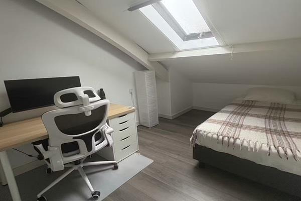 Eenpersoonsslaapkamer met raam, radiator en bureau met monitor