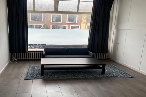 Een ruime kamer met een tweepersoonsbed, relaxfauteuil, kledingkast en bureau. De kamer is erg licht dankzij de grote ramen. De kamer bevindt zich in een klein woongebouw, vlakbij het centrum van Delft en de TU Delft.