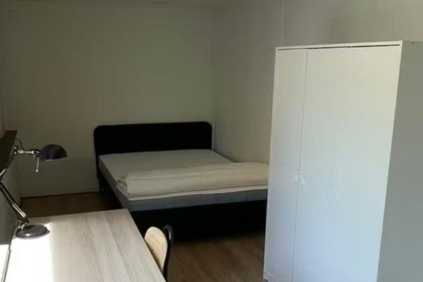 Een ruime kamer met een tweepersoonsbed, kledingkast en bureau. De kamer is erg licht dankzij de grote ramen. De kamer bevindt zich in een klein woongebouw, vlakbij zowel het centrum van Delft als de Technische Universiteit Delft.