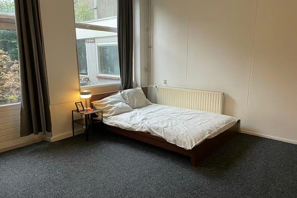 Een ruime kamer met een tweepersoonsbed, bank, kledingkast en bureau. De kamer is erg licht dankzij de grote ramen. De kamer bevindt zich in een klein woongebouw, vlakbij zowel het centrum van Delft als de Technische Universiteit Delft.
