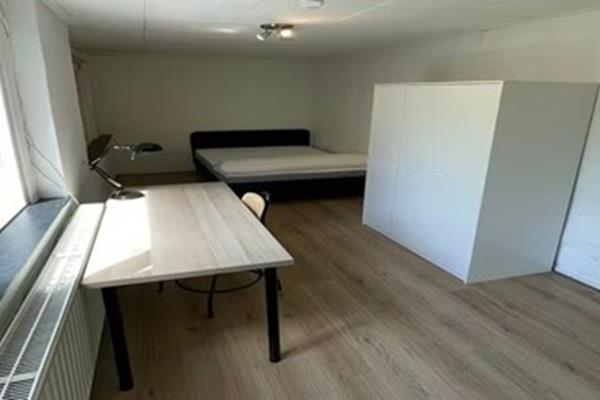 Een ruime kamer met een tweepersoonsbed, kledingkast en bureau. De kamer is erg licht dankzij de grote ramen. De kamer bevindt zich in een klein woongebouw, vlakbij zowel het centrum van Delft als de Technische Universiteit Delft.