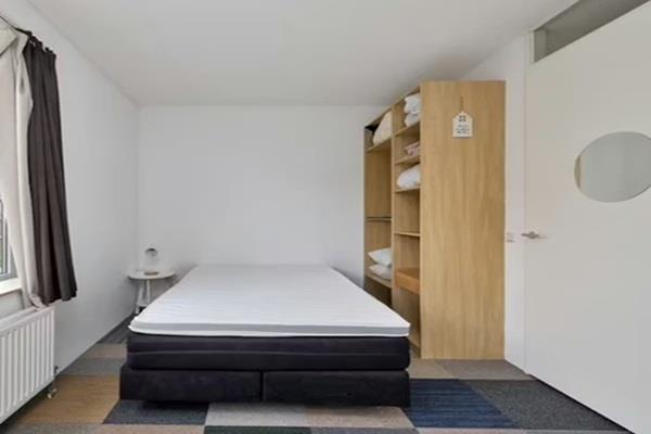 De slaapkamer is voorzien van een tweepersoonsbed, een ruime kledingkast, een bureau en beddengoed.