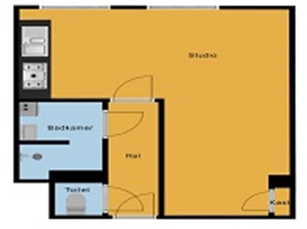 Indeling: entree/hal, toilet, badkamer met douche en wastafel, woon- slaapkamer met open keuken voorzien van diverse inbouwapparatuur.