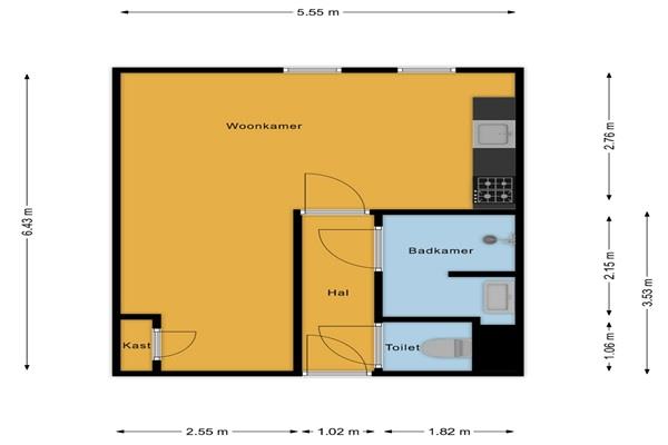 Indeling: entree/hal, toilet, badkamer met douche en wastafel, ruime woon- slaapkamer met keuken voorzien van koelkast, afzuigkap, magnetron en kookplaat.