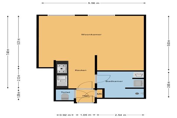Indeling: entree/hal, toilet, badkamer met douche en wastafel, woon- slaapkamer met keuken voorzien van diverse inbouwapparatuur.