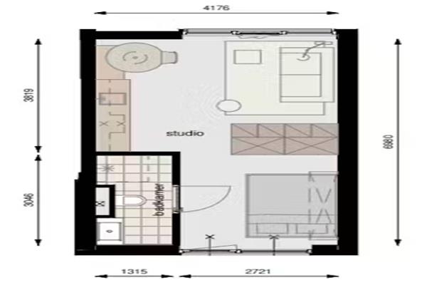 Het ontwerp van deze is zeer modern en stijlvol. Het Scandinavische interieur zorgt voor veel licht in de studio. De ruimte is slim verdeeld door middel van een bed-bureau. Dit meubelstuk functioneert uitgeklapt als bed (160x200 cm) en ingeklapt als bureau om ruimte te besparen.