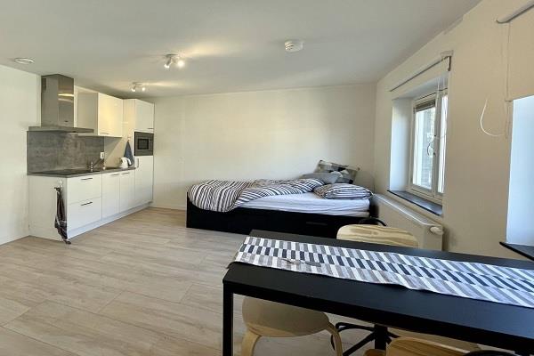 De studio is 21 vierkante meter en is gelegen op de tweede verdieping, aan de voorzijde van het gebouw. De studio is voorzien van een eigen keuken en eigen badkamer.