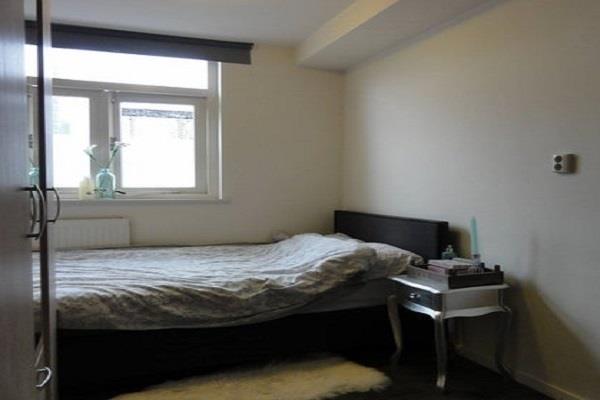 Lichte woonkamer aan de achterzijde met open keuken en toegang tot het balkon. De keuken is voorzien van een kookplaat, afzuigkap, koelkast en combimagnetron.