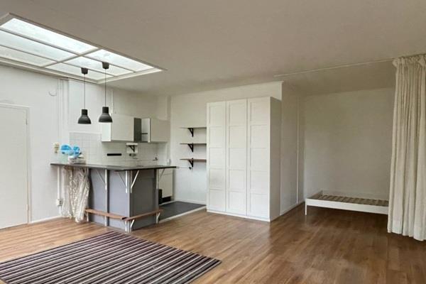 Een ruime en lichte studio met ingebouwde keuken en leuke bar waaraan je kan eten of borrelen. Een gedeelte van de kamer is makkelijk af te schermen, als slaapruimte.